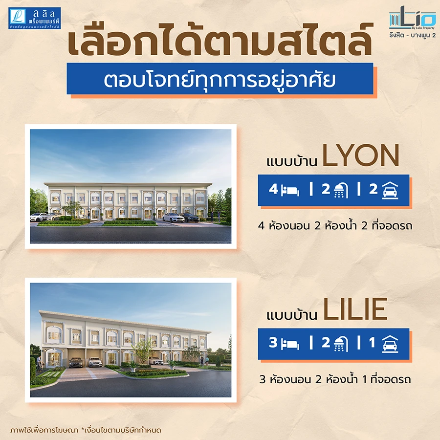ลลิล พร็อพเพอร์ตี้ จำกัด (มหาชน) เปิดทาวน์โฮมโครงการใหม่ Lio รังสิต - บางพูน 2 ทาวน์โฮมดีไซน์ใหม่ French Colonial Style การออกแบบทาวน์โฮมสไตล์ฝรั่งเศส ด้วยทั้ง 2 รูปแบบบ้าน ได้แก่  LILLE (ลีลล์) 3 ห้องนอน 2 ห้องน้ำ 1 ที่จอดรถ พื้นที่ใช้สอย 105 ตารางเมตร และ LYON (ลียง) 4 ห้องนอน 2 ห้องน้ำ 2 ที่จอดรถ พื้นที่ใช้สอย 125 ตารางเมตร มาพร้อมกับสวนส่วนกลางสไตล์ฝรั่งเศส, คลับเฮาส์, ฟิตเนส, ระบบรักษาความปลอดภัยด้วยการเข้า-ออก ด้วย Key Card Access, CCTV และพนักงานรักษาความปลอดภัย 24 ชั่วโมง