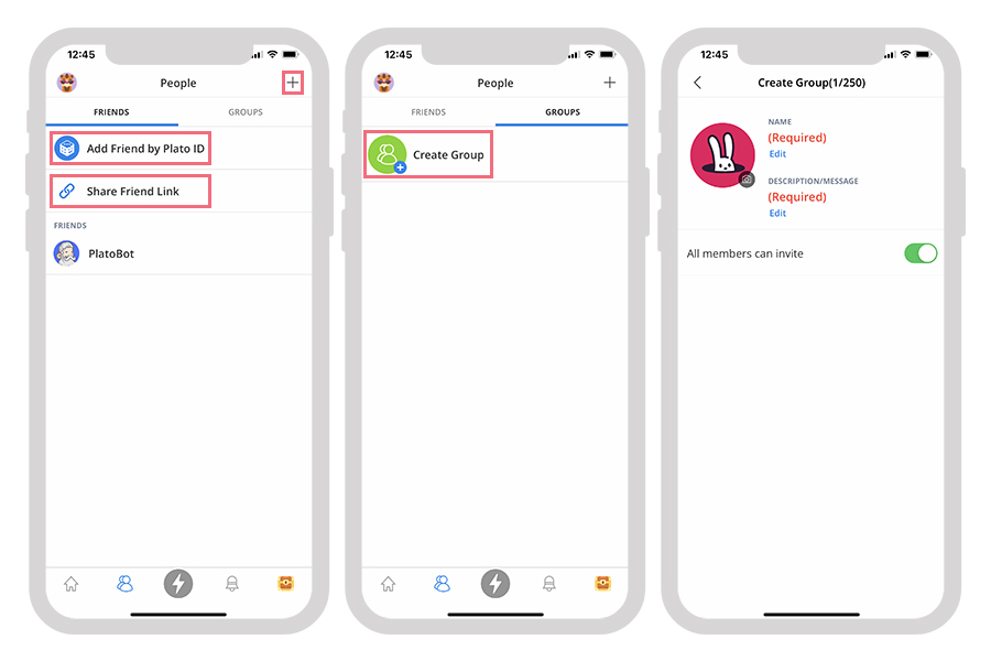 สำหรับใครมีที่เพื่อนขาเกมของตัวเองอยู่แล้ว และอยากสร้างห้องเกมส่วนตัวเพื่อเชิญเพื่อนเฉพาะกลุ่ม ก็สามารถสร้างกลุ่มของตัวเองได้ไม่ยาก โดยแตะเลือกที่สัญลักษณ์รูปคนทางด้านล่าง จะปรากฏฟีเจอร์สำหรับเพิ่มเพื่อน (Add Friends) ซึ่งสามารถทำได้ 2 วิธี นั่นคือการเพิ่มเพื่อนด้วยไอดีของแอปฯ Plato (Add Friend by Plato ID) หรือจะเพิ่มเพื่อนด้วยการแชร์ลิงก์ (Share Friend Link) ก็สะดวกด้วยกันทั้งคู่