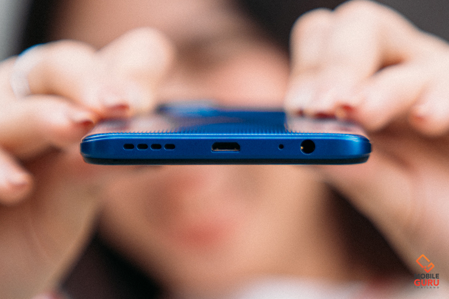 ตัวฝาหลังดูด้วยตาจะให้สีออกน้ำเงินไปทางครามมีประกายมุกจาง ๆ ออกแบบเป็นลายคลื่นเวลาเล่นกับแสงค่อนข้างสวย ฝาหลังมีผิวสัมผัสเรียบ วัสดุเป็นเนื้อด้าน ทำให้ไม่ติดลายนิ้วมือเลยแม้แต่น้อย ถือเป็นข้อดีอย่างหนึ่งเลยค่ะ ตัวกล้องหลังคู่ AI พร้อมแฟลชถูกวางไว้ด้านบนเยื่องไปทางซ้าย บนฐานกล้องที่นูนออกมาเพียงเล็กน้อย ใส่เคสที่แถมมาด้วยก็คลุมปิดไปพอดีค่ะ
