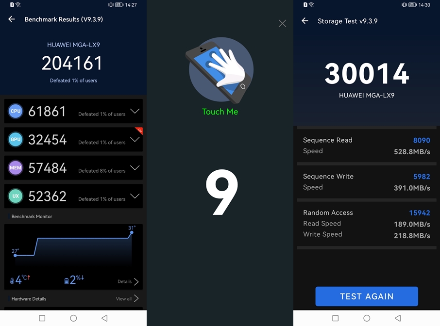 - ทดสอบด้วยแอปพลิเคชัน AnTuTu Benchmark ทำไปได้ 204,161 คะแนน
