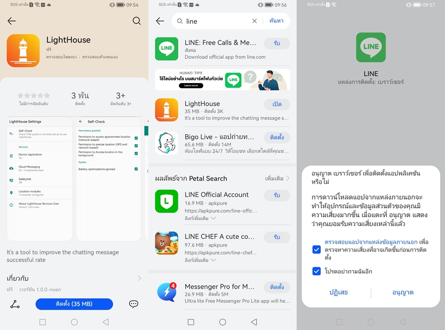 จากนั้นไปที่ HUAWEI AppGallery ศูนย์รวมแอปพลิเคชั่นของทาง HUAWEI แล้วดาวน์โหลดแอป Lighthouse (เลือกอนุญาตแอป Lighthouse ให้เข้าถึงตำแหน่งอุปกรณ์ตลอดเวลา) จากนั้นให้เข้าไปดาวน์โหลดแอปพลิเคชัน Line ผ่านทาง HUAWEI AppGallery จากนั้นก็ใช้งาน Line ได้ตามปกติเลยครับ