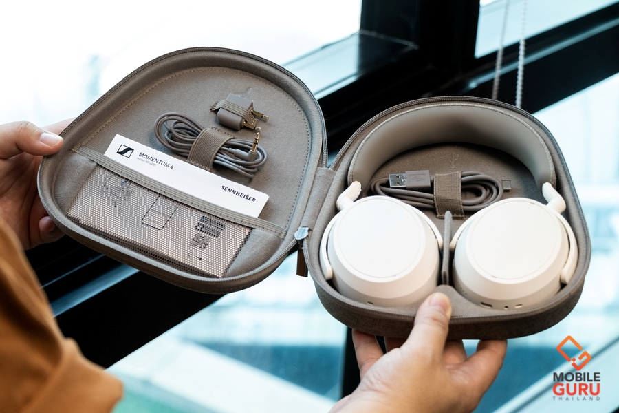 เปิดกระเป๋าจะพบกับตัวหูฟัง Sennheiser Momentum 4 Wireless, สายชาร์จ USB-C, สายหูฟัง 2.5 มม. แปลง 3.5 มม., หัวแจ็คสำหรับบนเครื่องบิน (Airplane Headphone Adapter) และคู่มือ เรียกได้ว่ามีมาให้ครบเลยครับ และจัดเป็นสัดส่วนพกพาสะดวก
