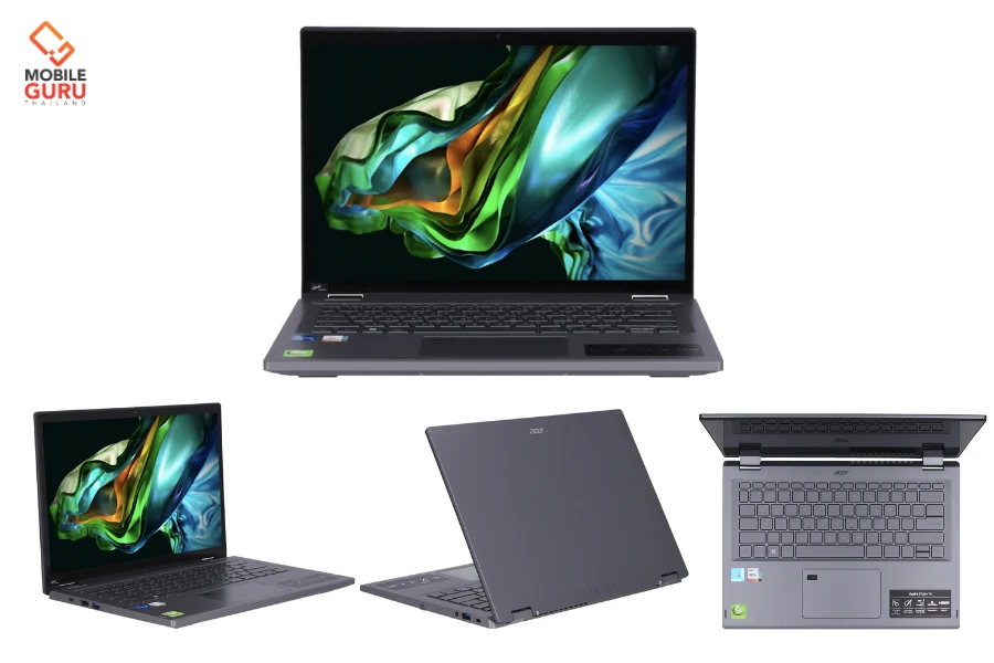 ACER SPIN 5 (A5SP14-51MTN-54VT) รุ่นนี้ให้ความจุ RAM มามากถึง 16GB LPDDR5 (Onboard) Storage SSD 512GB ใช้ซีพียูรุ่นใหม่เช่นเดียวกัน คือ Intel Core i5-1335U พร้อมการ์ดจอ Intel Iris Xe Graphics (Integrated) ในตัว มีพอร์ตมาให้ค่อนข้างครบครัน เช่น Thunderbolt 4, USB 3.2 Type-A, HDMI 2.1, Headphone/mic combo มีกล้อง Webcam FHD คมชัด แถมมีปากกา Stylus มาให้ แต่น้ำหนักอาจมากกว่าเพื่อนใน 5 รุ่นนี้ โดยอยู่ที่ 1.6 kg ซึ่งก็ยังสามารถพกพาได้ดี ไม่ได้หนักจนเกินไป