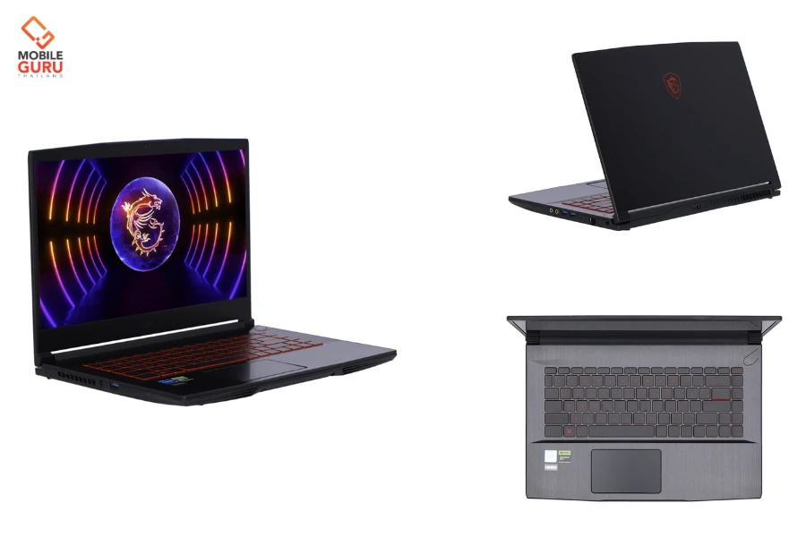 รุ่นนี้ให้ลุคไซเบอร์ด้วยไฟคีย์บอร์ดที่เป็นสีฟ้าครับ ฝาหลังดีไซน์เรียบๆ มีโลโก้รูปมังกร บ่งบอกถึงเป็นแบรนด์ MSI ด้านหน้าจอมีขนาด 15.6 นิ้ว พาเนล IPS ความละเอียด Full HD (1920 x 1080), Refresh rate 144Hz ใช้งานเล่นเกม ดูหนัง เล่นโซเชียลได้ดี และมีน้ำหนักที่ 2 kg. ถือว่าเบากว่าโน้ตบุ๊กหลายๆ รุ่นเลยครับ