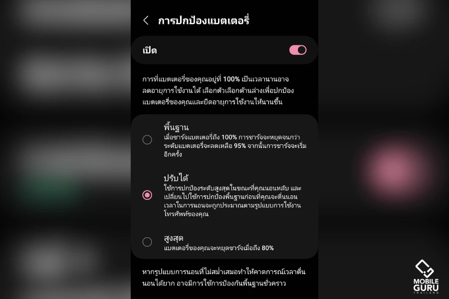 ถือว่าเป็นฟีเจอร์ที่อัปเดตมาใช้งานได้ง่าย และช่วยรักษาอายุการใช้งานแบตเตอรี่ของเราด้วยนะครับ ส่วนตัวแล้วผู้เขียนชอบแบบโหมด "ปรับได้" ค่อนข้างยืดหยุ่น หากเราอยู่ในช่วงเวลานอนหลับแบตเตอรี่ก็จะชาร์จไวแค่ 80% หากใกล้เวลาตื่นนอนแบตเตอรี่ก็ชาร์จมาเต็ม 100% ให้ครับ และถ้าใครได้อัปเดต One UI 6.1 กันแล้ว ก็สามารถเข้าไปปรับการใช้งานปกป้องแบตเตอรี่ของเราได้ครับ
