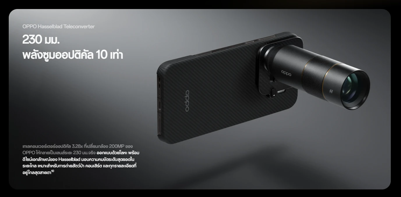 และที่พิเศษกับ OPPO Hasselblad Teleconverter จะเป็นอุปกรณ์เสริมสำหรับกล้องซูม 200MP ที่จะเพิ่มระยะการถ่ายเป็น 230 มม. แบบ Optical โดยวัสดุเป็นโลหะแข็งแรง พร้อม LOGO Hasselblad เหมาะกับใครที่เป็นสายท่องเที่ยว เดินป่า ก็ถ่ายสัตว์ได้จากระยะไกล หรือสายคอนเสิร์ต ก็สามารถเก็บภาพและวิดีโอได้แบบชัดๆ แม้ได้บัตรที่นั่งอยู่ไกล (ราคา 6,999 บาท)