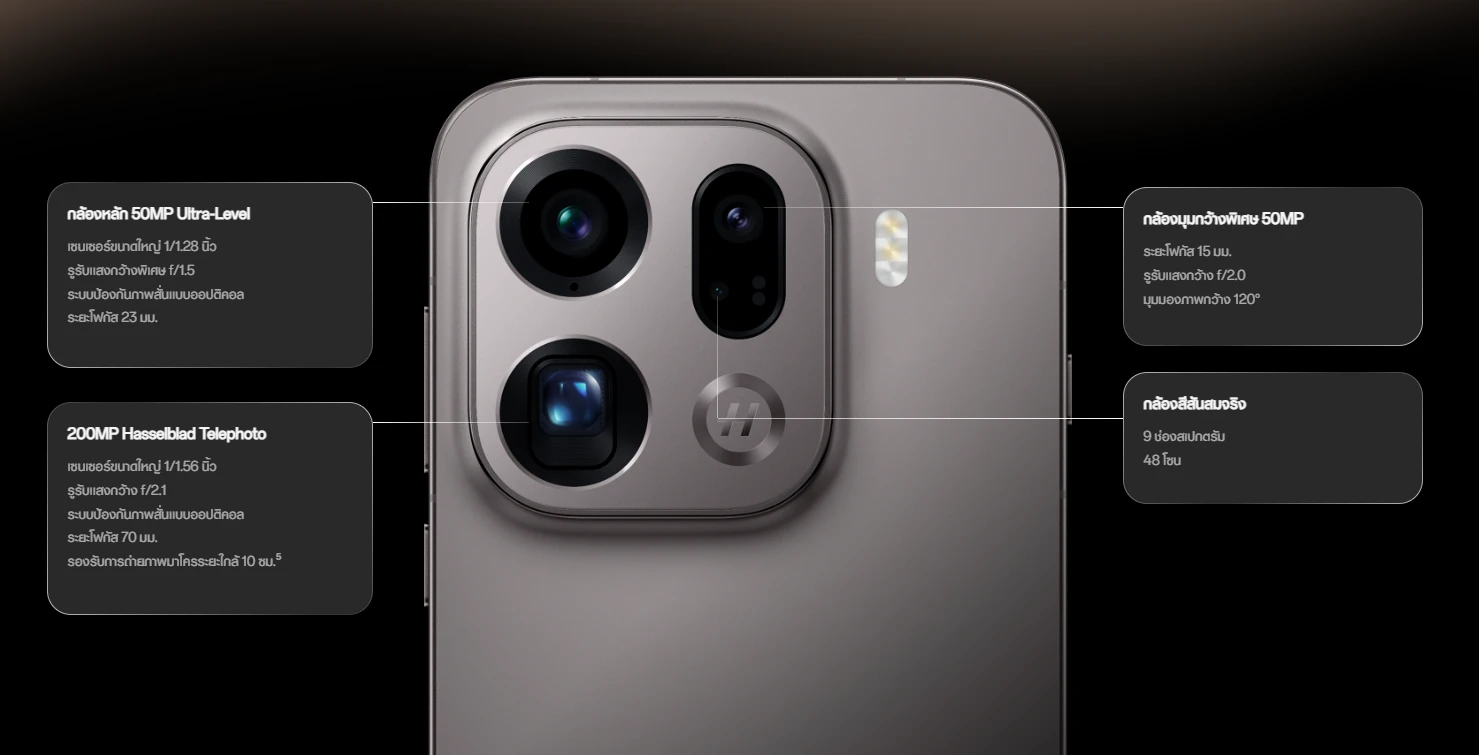 - กล้องหลัง: Hasselblad 50MP f/1.5, OIS + Ultrawide 50MP f/2.0 + Periscope Telephoto 3x 200MP f/2.1, OIS