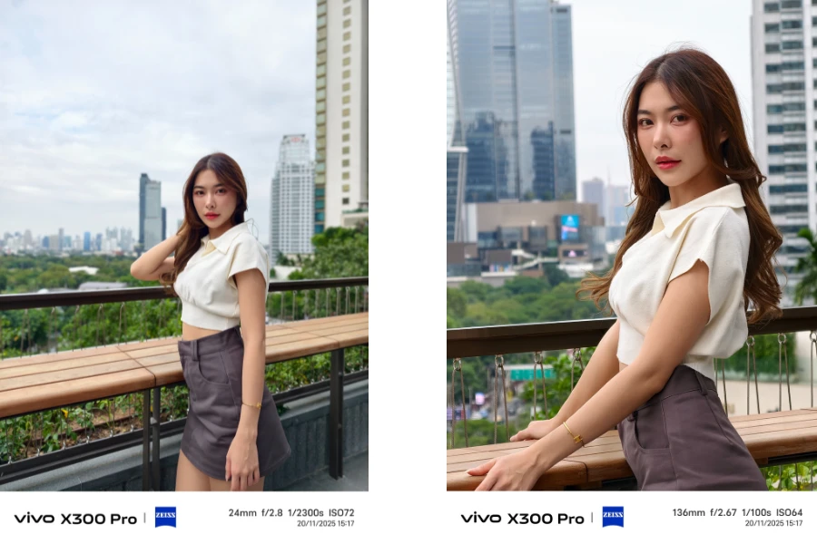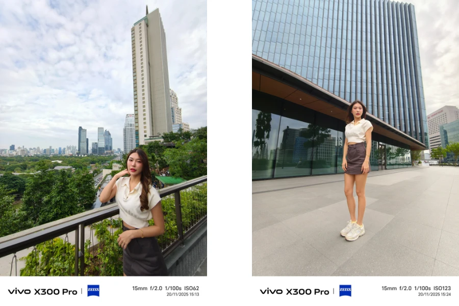 ด้านกล้อง vivo X300 Pro ด้านกล้องหลังของ vivo X300 Pro มีมา 3 กล้อง ซึ่งได้พัฒนาร่วมกับทาง ZEISS แบรนด์เลนส์กล้องระดับโลก โดยกล้องหลัก เซนเซอร์ LYT828 ขนาด 1/1.28" ความละเอียด 50MP, f/1.57, OIS + Ultrawide เซนเซอร์ JN1 ขนาด 1/2.76" ความละเอียด 50MP, f/2.0, OIS + Telephoto (85mm) เซนเซอร์ HPB ขนาด 1/1.4" ความละเอียด 200MP, f/2.67 จากการใช้งานหลัง 3 เลนส์ถ่ายภาพออกไปได้คมชัด เก็บทุกรายละเอียดได้ชัดเจนดีมาก มีการเคลือบ ZEISS T* Coating เพื่อช่วยลดการเกิดแสง โกสต์และแสงแฟลร์ได้ดี ด้านสกินโทนถ่ายผิวคนได้สวยสดใส แม้มีการปรับผิวให้ดูกระจ่างใส แต่ยังคง Texture บนผิวหน้าคนไว้ให้ดูสมจริง เรื่องการเปลี่ยนเลนส์กล้องทำได้ค่อนข้างเร็ว แต่กล้อง Ultrawide มุมภาพยังคงมีความแคบไปเล็กน้อย ส่วนกล้อง Telephoto เป็นกล้องที่เมื่อได้ลองใช้งานจริงแล้วค่อนข้างชอบ เพราะใช้เซนเซอร์ใหม่ HPB สามารถถ่าย Portrait หรือซูมไกลได้ภาพที่ชัดด้วยความละเอียด 200MP ทำให้ซูมถึงระยะ 242mm แล้วไม่เสียรายละเอียดของภาพมากนัก