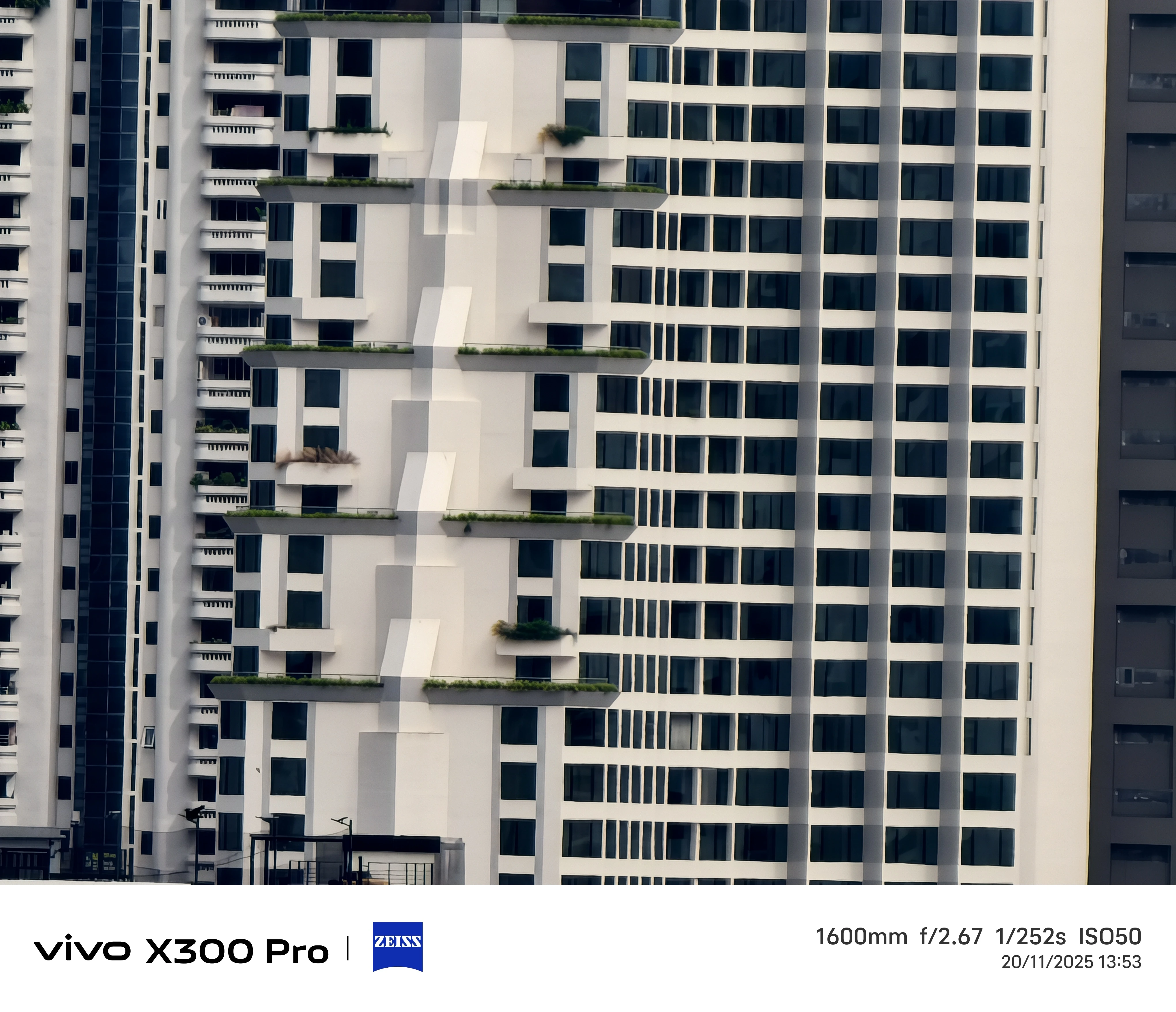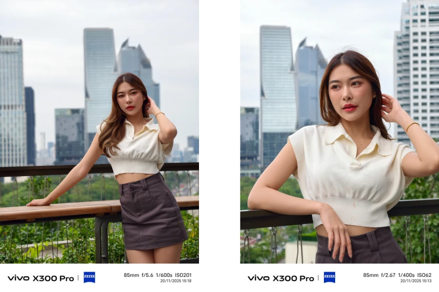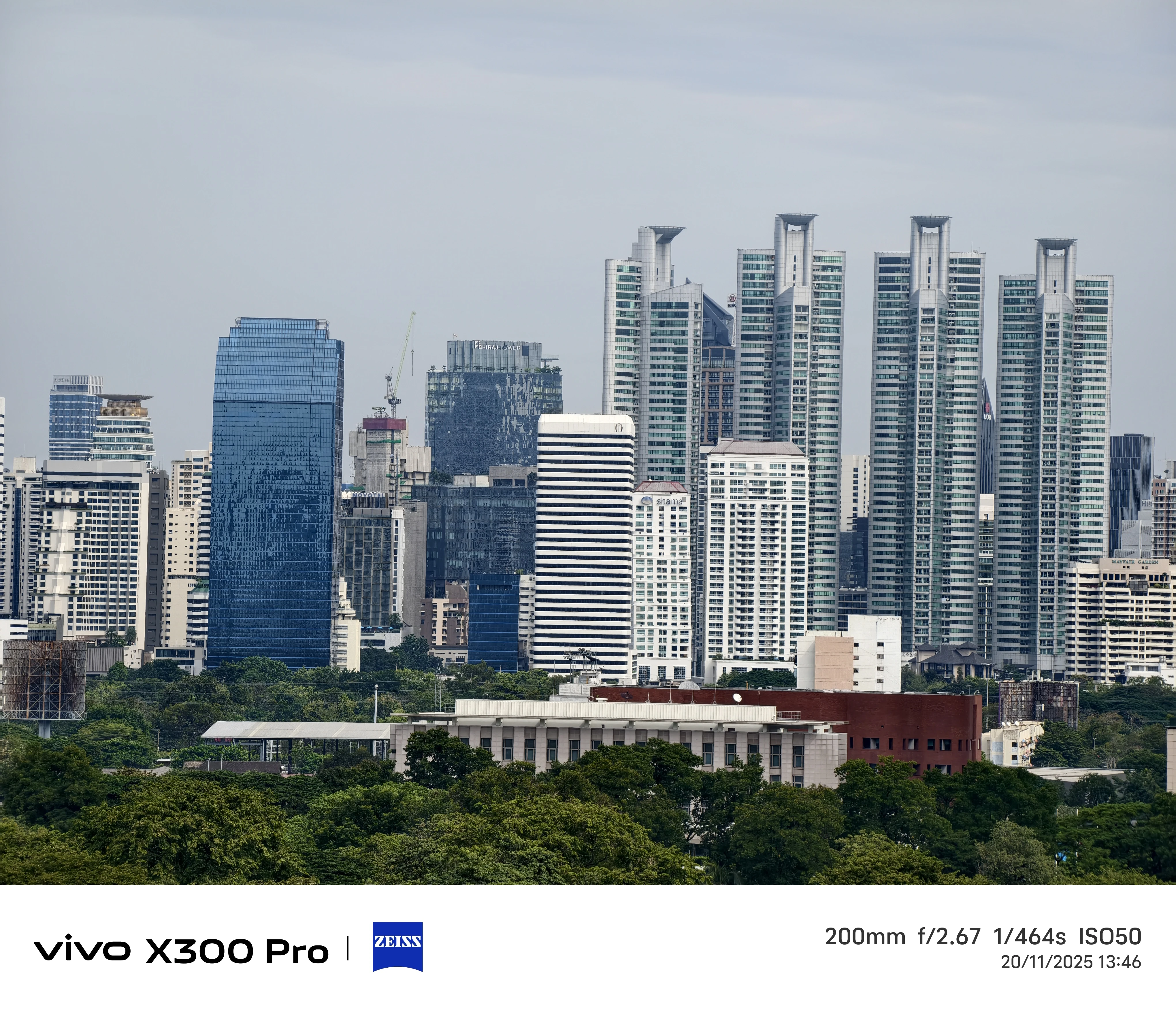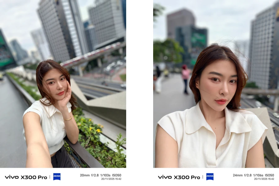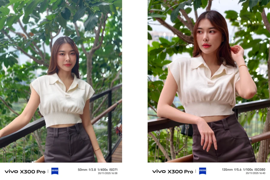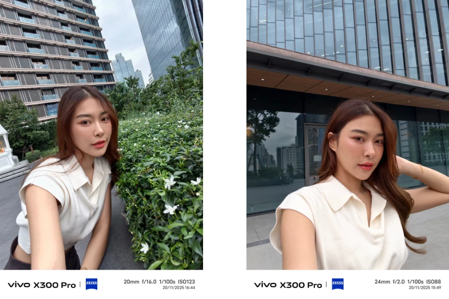 ด้านกล้อง vivo X300 Pro ด้านกล้องหลังของ vivo X300 Pro มีมา 3 กล้อง ซึ่งได้พัฒนาร่วมกับทาง ZEISS แบรนด์เลนส์กล้องระดับโลก โดยกล้องหลัก เซนเซอร์ LYT828 ขนาด 1/1.28" ความละเอียด 50MP, f/1.57, OIS + Ultrawide เซนเซอร์ JN1 ขนาด 1/2.76" ความละเอียด 50MP, f/2.0, OIS + Telephoto (85mm) เซนเซอร์ HPB ขนาด 1/1.4" ความละเอียด 200MP, f/2.67 จากการใช้งานหลัง 3 เลนส์ถ่ายภาพออกไปได้คมชัด เก็บทุกรายละเอียดได้ชัดเจนดีมาก มีการเคลือบ ZEISS T* Coating เพื่อช่วยลดการเกิดแสง โกสต์และแสงแฟลร์ได้ดี ด้านสกินโทนถ่ายผิวคนได้สวยสดใส แม้มีการปรับผิวให้ดูกระจ่างใส แต่ยังคง Texture บนผิวหน้าคนไว้ให้ดูสมจริง เรื่องการเปลี่ยนเลนส์กล้องทำได้ค่อนข้างเร็ว แต่กล้อง Ultrawide มุมภาพยังคงมีความแคบไปเล็กน้อย ส่วนกล้อง Telephoto เป็นกล้องที่เมื่อได้ลองใช้งานจริงแล้วค่อนข้างชอบ เพราะใช้เซนเซอร์ใหม่ HPB สามารถถ่าย Portrait หรือซูมไกลได้ภาพที่ชัดด้วยความละเอียด 200MP ทำให้ซูมถึงระยะ 242mm แล้วไม่เสียรายละเอียดของภาพมากนัก