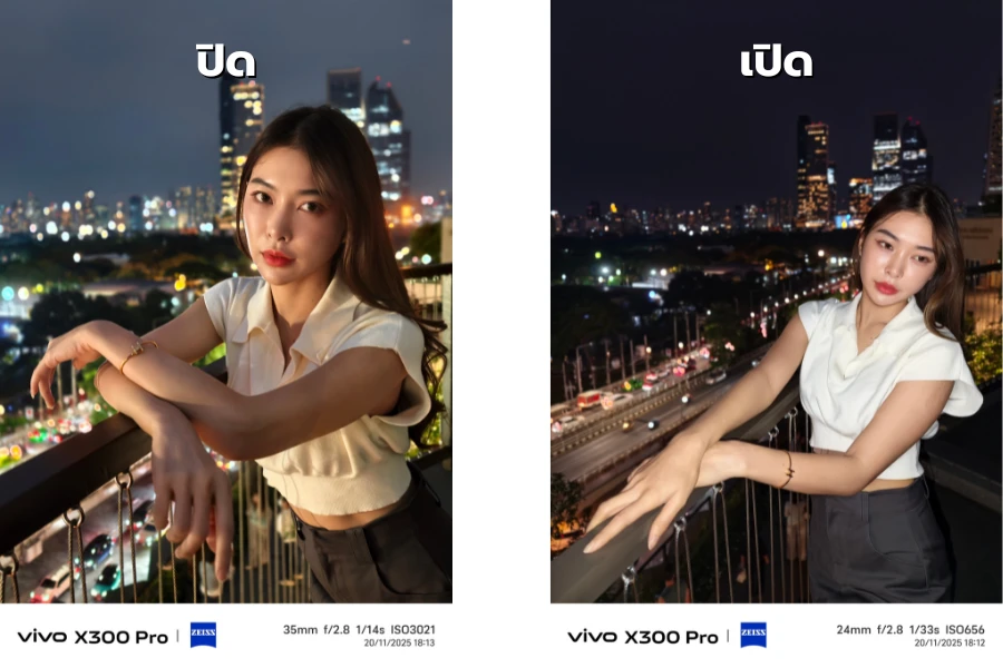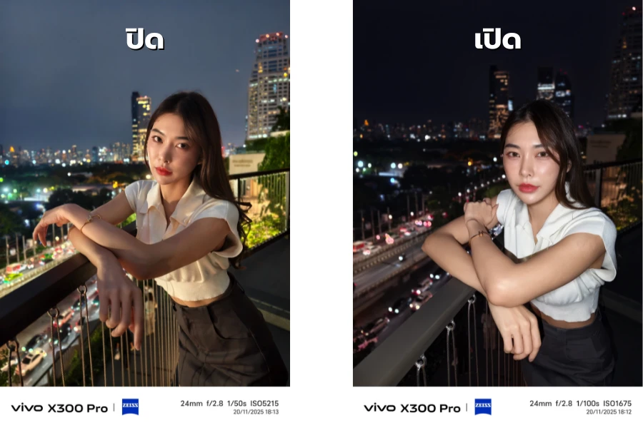 vivo X300 Pro มาพร้อมแฟลชคู่แบบ Diffuser (24 มม.) และ Converger (85 มม.) ช่วยให้ถ่ายภาพช่วงกลางคืนได้ชัดขึ้น แม้อยู่ในแสงที่มืด ซึ่ง vivo X300 Pro ทำได้ดีมากเลยครับ ไม่ว่าจะปิดหรือเปิดแฟลช เพราะสถานที่จริงตอนถ่ายค่อนข้างมืดกว่าในภาพมาก แต่สามารถถ่ายออกมาได้สว่าง ภาพคมชัด ไม่ค่อยมี Noise ในภาพ (แนะนำว่าให้ถือกล้องนิ่งๆ เนื่องจากถ่ายภาพในที่แสงน้อย Shutter Speed จะต่ำมาก ทำให้ภาพสั่นไหวได้)