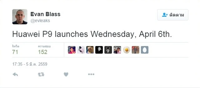 จนล่าสุด Huawei ได้ทำการส่งจดมายเชิญสื่อมาร่วมงานอีกครั้ง ในวันที่ 6 เมษายนนี้ ภายใต้คอนเซ็ปต์ที่ว่า "Change the way you see the world" และคาดว่างานนี้จะเป็นการเปิดตัวสมาร์ทโฟน Huawei P9 อย่างแน่นอน เช่นเดียวกับทาง Evan Bless นักปล่อยข่าวและภาพหลุดมือถือรุ่นต่างๆ ที่ได้โพสต์ผ่านทวิตเตอร์ของเขาที่ชื่อว่า @evleaks ด้วยว่า "Huawei P9 จะเปิดตัวในวันพุธที่ 6 เมษายนนี้"