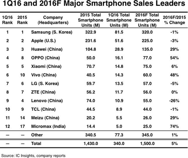 Samsung ถือเป็นผู้ขายรายใหญ่ที่สุดของสมาร์ทโฟนช่วงไตรมาสแรกของปี 2016 ขายไป 81.5 ล้านเครื่องช่วง 3 เดือนแรกของปี และถัดมาในช่วงเวลาเดียวกัน Apple ขายไป 51.6 ล้านเครื่อง และมีอยู่อีก 8 ค่ายมือถือที่น่าสนใจ จาก 12 อันดับซึ่งเป็นค่ายที่มาจากประเทศจีนทั้งหมด อันดับ 3-5 จะเป็น Huawei, Oppo และ Xiaomi ที่เหลือก็จะเป็น Vivo, ZTE , Lenovo, TCL และ Meizu ทำให้เห็นว่าตลาดสมาร์ทโฟนในประเทศจีนนั้นมีตวามต้องการสินค้าค่อนข้างสูงเลยทีเดียว และที่น่าแปลกใจอีกอย่างคือมีสมาร์ทโฟนจากประเทศอินเดีย Micromax ติดอันดับที่ยอดขาย 5.0 ล้านเครื่องด้วยเช่นกัน