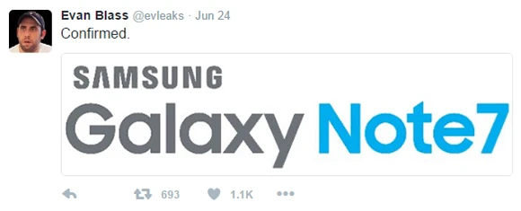 Evan Blass (@evleaks) จอมปล่อยข่าวลือและภาพหลุดมือถือชื่อดัง ได้โพสต์ข้อความผ่านทวิตเตอร์ยืนยันว่า สมาร์ทโฟนรุ่นใหม่ของซัมซุงจะใช้ชื่อว่า Samasung Galaxy Note 7