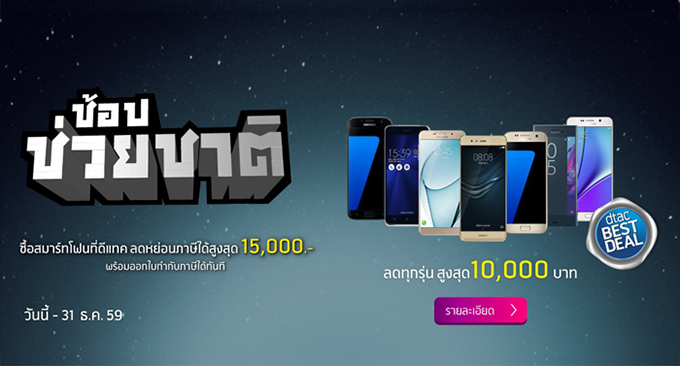 ดีแทค จัดโปรโมชั่น "ช้อปช่วยชาติ 2559" ซื้อสมาร์ทโฟนที่ดีแทค ลดหย่อนภาษีได้สูงสุด 15,000 บาท (พร้อมออกใบกำกับภาษีได้ทันที) สุดพิเศษ! กับโปรโมชั่นผ่อนชำระ 0% ผ่านบัตรเครดิตที่ร่วมรายการ วันนี้ - 31 ธันวาคม 2559
