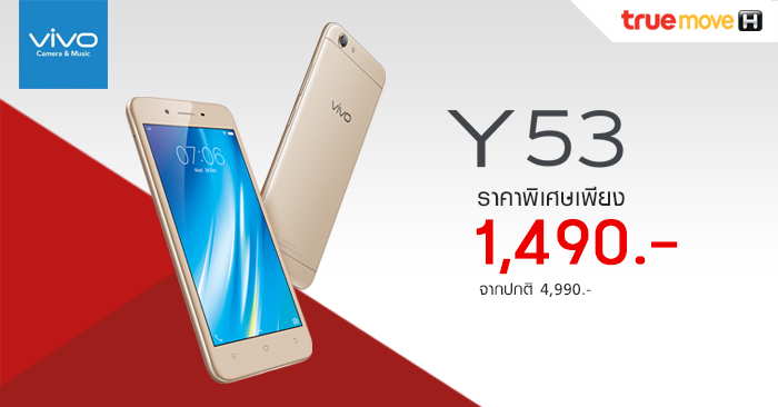 พิเศษสุด ๆ ซื้อสมาร์ทโฟน Vivo Y53 กับ ทรูมูฟ เอช ได้ในราคาสุดพิเศษ เพียง 1,490 บาท (จากราคาเต็ม 4,990 บาท) เพียงเปิดเบอร์ใหม่กับ ทรูมูฟ เอช พร้อมเหมาแพ็คเก็จ 399 บาทขึ้นไป โดยต้องชำระค่าบริการล่วงหน้า 1,000 บาท ระยะเวลาสัญญา 12 เดือน โปรโมชั่นดีๆ แบบนี้ เฉพาะที่ทรูช้อปเท่านั้น