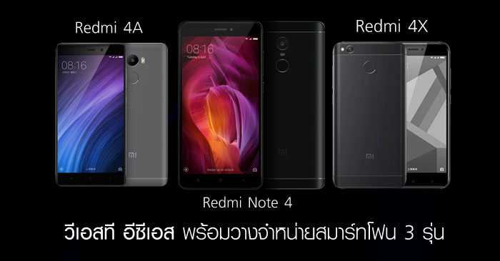 บริษัท วีเอสที อีซีเอส (ประเทศไทย) จำกัด แนะนำสมาร์ทโฟนที่นำมาเปิดตลาดล่าสุด 3 รุ่นจาก xiaomi ที่มาพร้อมด้วยสเปคคุณภาพสูง ดีไซน์สวยล้ำ คุณสมบัติเป็นเลิศ ในราคาสุดคุ้มค่า ได้แก่ Redmi Note 4, Redmi 4X และ Redmi 4A ซึ่งปัจจุบันบริษัท วีเอสที อีซีเอส (ประเทศไทย) ได้รับการแต่งตั้งให้เป็นผู้แทนจำหน่ายเซี่ยวมี่อย่างเป็นทางการในประเทศไทย พร้อมให้คุณอุ่นใจด้วยบริการหลังการขายจากศูนย์บริการเซี่ยวมี่ โดยวีเซิร์ฟพลัส ซึ่งมีศูนย์บริการพร้อมเอนจิเนียร์ผู้เชี่ยวชาญระดับมืออาชีพให้บริการคุณถึง 10 สาขาทั่วไทย