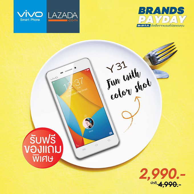 มีมาเรื่อยๆ สำหรับโปรโมชั่นจาก ลาซาด้า ล่าสุดมาในแคมเปญ Brands Payday ลดกันสุดๆ ไปเลยสำหรับสมาร์ทโฟนจาก Vivo รุ่น Y31 ตัวเล็กสเปคแรง จากราคา 4,990 บาท ลดเหลือเพียง 2,990 บาทเท่านั้น พร้อมของแถมอีกมากมาย ไม่หมดเพียงแค่นี้ ยังโปรโมชั่นสำหรับสมาร์ทโฟนรุ่นอื่นๆ อีกเพียบ ตั้งแต่วันนี้ ถึง 27 กรกฎาคม 2560 ที่ LAZADA ร้าน VivoThailand