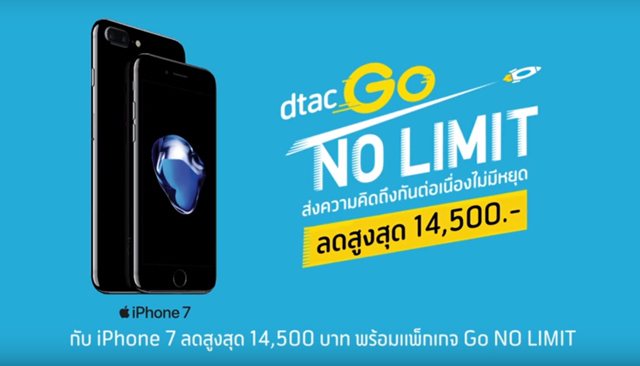 ใครอยากมีเน็ตใช้ได้แบบไม่อั้น ไม่ลดสปีด แค่สมัคร แพ็กเกจ Go NO LIMIT เริ่มต้นเพียง 499 บาท หรือคุณสามารถเลือกความเร็วอินเทอร์เน็ตได้ไม่อั้นได้ตามการใช้งาน และโทรฟรีเบอร์ดีแทคตลอด 24 ชม. พร้อมรับส่วนลด iPhone 7 สูงสุด 14,500 บาท ที่ศูนย์บริการดีแทคทั่วประเทศ