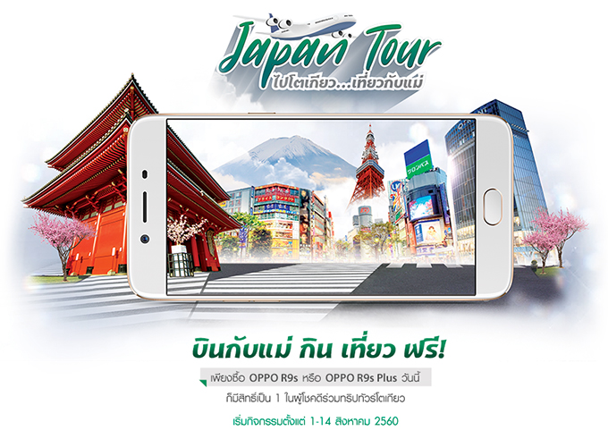 ให้วันแม่ปีนี้ประทับใจกว่าที่เคย ออปโป้ ให้คุณลุ้นเป็น 1 ในผู้โชคดี ไปทัวร์โตเกียวกับแม่ฟรี ได้ง่ายๆ กับกิจกรรม "OPPO Japan Tour ไปโตเกียวเที่ยวกับแม่" เพียงซื้อสมาร์ทโฟน OPPO R9s หรือ OPPO R9s Plus ตั้งแต่วันนี้ - 14 สิงหาคม งานนี้บินกับแม่ กิน เที่ยว ฟรี!