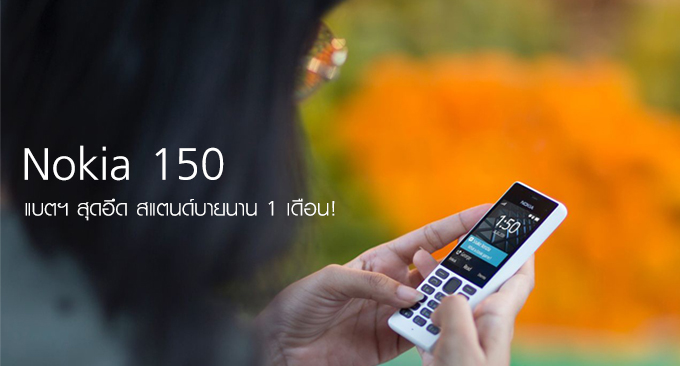 Nokia 150 และ Nokia 150 Dual SIM รองรับแค่ 2G เท่านั้น GSM 900 / 1800 ตัวเครื่องมีขนาด 118 x 50.2 x 13.5 มม. น้ำหนัก 81 กรัม, หน้าจอ TFT ขนาด 2.4 นิ้ว ความละเอียด 240 x 320 pixels (167 ppi), รองรับ Micro SD Card สูงสุด 32GB, กล้องความละเอียด VGA พร้อมไฟแฟลช, รองรับการเชื่อมต่อ Bluetooth 3.0, SLAM (เทคโนโลยีของ Nokia จะค้นหาสัญญาณ Bluetooth ที่อย่างใกล้ที่สุด แล้วส่ง File ที่ต้องการโดยไม่ต้องจับคู่อุปกรณ์), Micro USB, มีวิทยุในตัว, แบตเตอรี่ความจุ 1,020 mAh สามารถสแตนด์บายได้ยาวนาน 31 วัน และสนทนาต่อเนื่องได้นานถึง 22 ชั่วโมง เหมาะสำหรับคนที่ต้องการใช้งานโทรศัพท์เท่านั้นจริงๆ ในเครื่องมีเกม Snake ให้ลองเล่นด้วยครับ เป็นเพียงแค่เกมทดลองเล่น ถ้าชอบค่อยซื้อจริงๆ (น่าจะแถมตัวเต็มมาให้เลยนะครับเนี่ย)