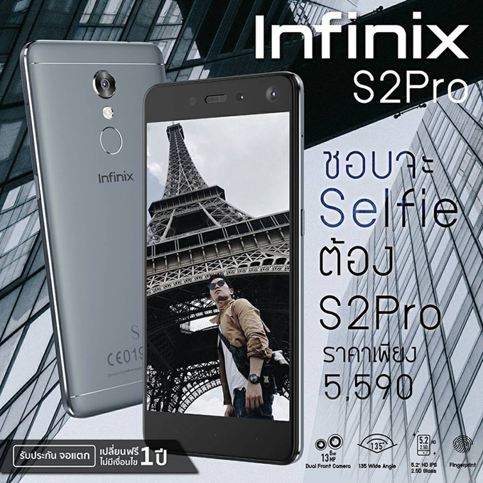 Infinix S2 Pro สุดยอดสมาร์ทโฟนเลนส์ไวด์กล้องหน้าคู่ที่ช่วยให้เราสามารถเก็บภาพความประทับใจของเราได้ตลอดเวลา และยังมาพร้อมหน้าจอ 5.2 นิ้ว หน่วยประมวลผล Octa Core, RAM 3GB หน่วยความจำภายใน 32GB ใช้ระบบปฎิบัติการ XOS แถมยังรองรับการใช้งานได้ 2 ซิม มาพร้อมการใช้งานที่ครบครัน แถมยังมีการรับ