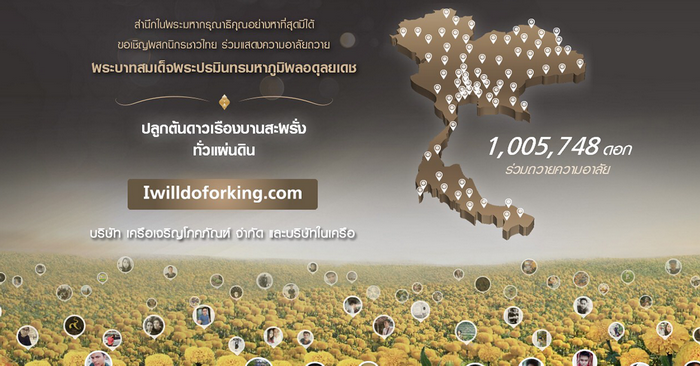 ด้วยสำนึกในพระมหากรุณาธิคุณอย่างหาที่สุดมิได้ เครือเจริญโภคภัณฑ์และทรู คอร์ปอเรชั่น โดย นายศุภชัย เจียรวนนท์ ประธานคณะผู้บริหาร เครือเจริญโภคภัณฑ์ และประธานคณะกรรมการบริหาร บมจ.ทรู คอร์ปอเรชั่น นำคณะผู้บริหารและพนักงาน ร่วมปลูกต้นดาวเรืองให้เหลืองอร่ามบานสะพรั่งทั่วแผ่นดิน ในช่วงพระราชพิธีถวายพระเพลิงพระบรมศพ พระบาทสมเด็จพระปรมินทรมหาภูมิพลอดุลยเดช บรมนาถบพิตร ณ อาคารสำนักงานเครือทั้งในและต่างประเทศทั่วโลก