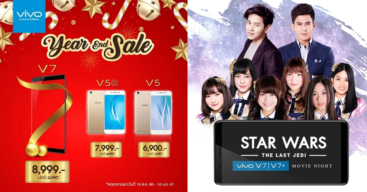 Vivo ส่งต่อความพิเศษส่งท้ายปี 2017 กับโปรโมชั่น YEAR END SALE สุดพิเศษที่เอาใจผู้ที่รักสมาร์ทโฟน หรือท่านที่กำลังมองหาของขวัญในเทศกาลส่งต่อความสุขปลายปีนี้ Vivo เอาใจกับโปรโมชั่นพิเศษกับ Vivo ทั้ง 3 รุ่นยอดนิยมด้วยกัน ได้แก่ Vivo V7, V5s และ V5