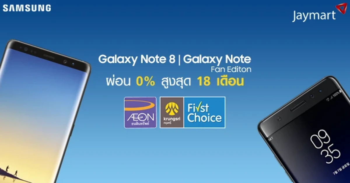 Jaymart จัดโปรโมชั่นกับคู่หูสมาร์ทโฟนกระแสแรงจาก ซัมซุง ที่มาพร้อมการใช้งานระดับมืออาชีพ Samsung Galaxy Note 8 และ Samsung Galaxy Note Fan Edition เอาใจคนชอบผ่อนสบายๆ 0% นานสูงสุด 18 เดือน กับบัตรเครดิต Aeon และ Krungsri First Choice พร้อมฟรี! ประกันหน้าจอแตกนาน 6 เดือน (เมื่อสมัคร Enjoy Card) ตั้งแต่วันนี้ - 31 ม.ค. 2561 ที่ Jaymart ทุกสาขาทั่วประเทศ