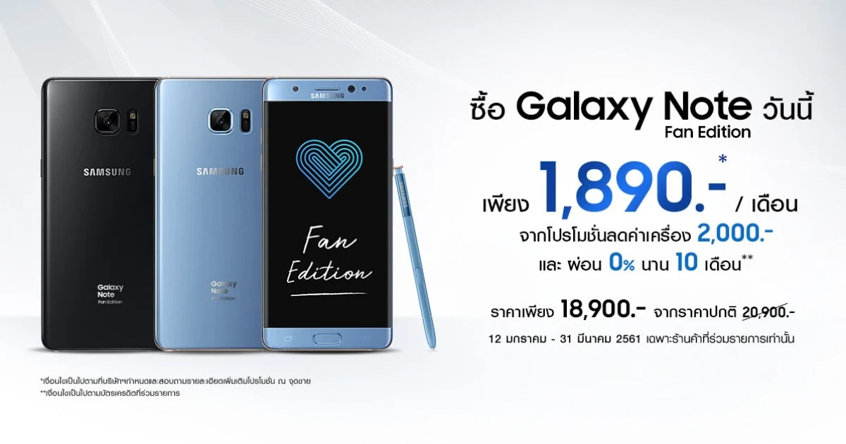 ซัมซุง จัดโปรโมชั่นพิเศษ เอาใจคนกำลังมองหาสมาร์ทโฟน ซื้อ Samsung Galaxy Note Fan Edition วันนี้ ในราคาพิเศษ เพียง 18,900 บาท (จากราคาปกติ 20,900 บาท) พร้อมรับสิทธิผ่อนสบาย 0% นาน 10 เดือน กับบัตรเครดิตที่ร่วมรายการ เพียงเดือน 1,890 บาท (จากโปรโมชั่นลดค่าเครื่อง 2,000 บาท)