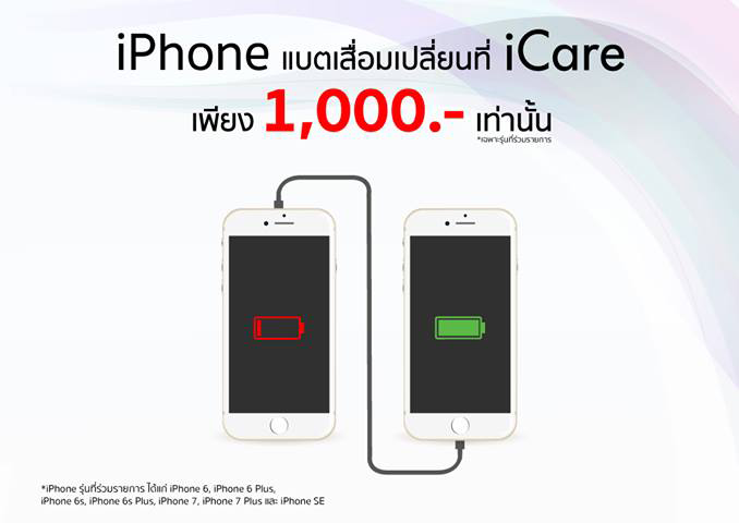 สำหรับประเทศไทย นโยบายลดราคาการเปลี่ยนแบตเตอรี่ของ Apple ก็มีผลเช่นกันครับ สามารถไปเปลี่ยนแบตเตอรี่กันได้ที่ iCare ศูนย์ซ่อมและบริการตัวแทนของ Apple ในเพียง 1,000 บาทเท่านั้นโดยรุ่นที่สามารถเปลี่ยนได้ตามนโยบายมีดังต่อไปนี้ iPhone 6, iPhone 6 Plus, iPhone 6s, iPhone 6s Plus, iPhone 7, iPhone 7 Plus และ iPhone SE (ส่วน iPhone 8, iPhone 8 Plus และ iPhone X ก็อยู่ในโครงการนี้ด้วยครับ)