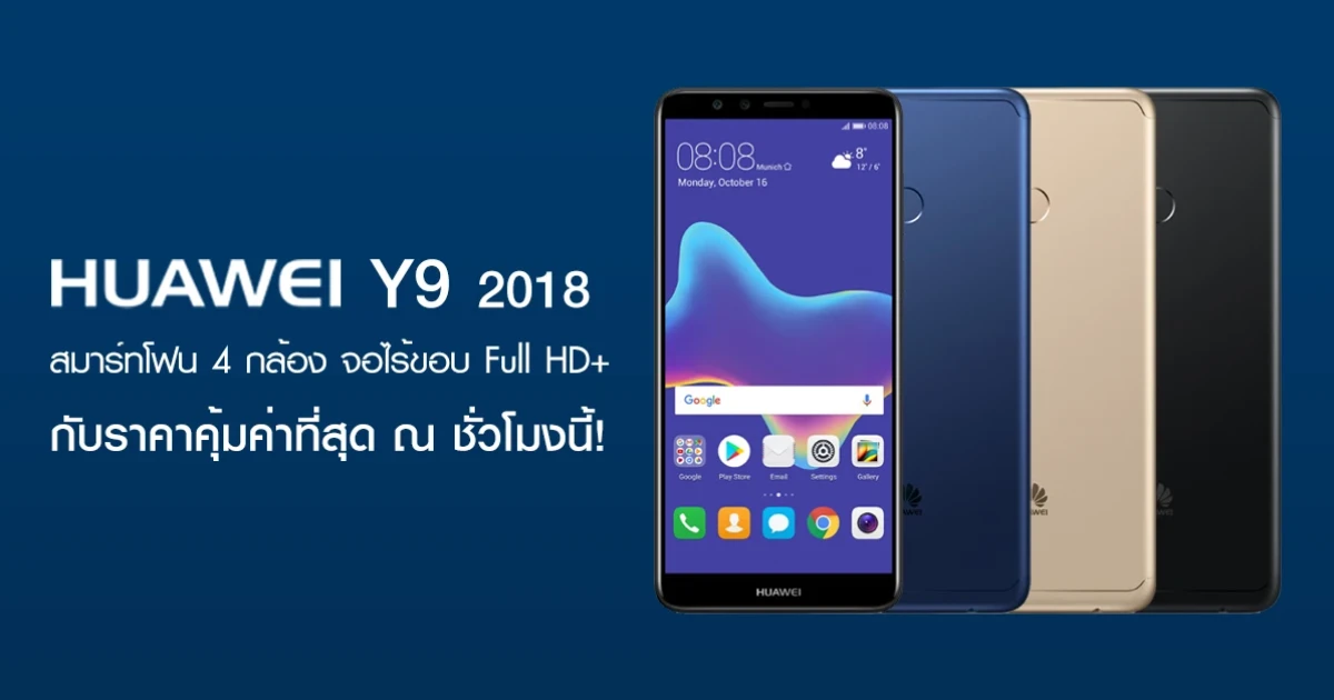 Huawei Y9 2018 จะมีให้เลือก 3 สี ได้แก่ ดำ, น้ำเงิน, ทอง ครบทุกสีเลยครับ ราคาเปิดตัวเพียงแค่ 6,990 บาท เท่านั้น เปิดให้จองตั้งแต่วันพรุ่งนี้ - 29 มี.ค. พร้อมรับฟรี Huawei Body Fat Scale เครื่องชั่งน้ำหนักอัจฉริยะ ราคา 2,990 บาท และของแถมอื่นๆ ตามแต่ละตัวแทนจำหน่ายครับ เรียกว่าคุ้มมากจริงๆครับ