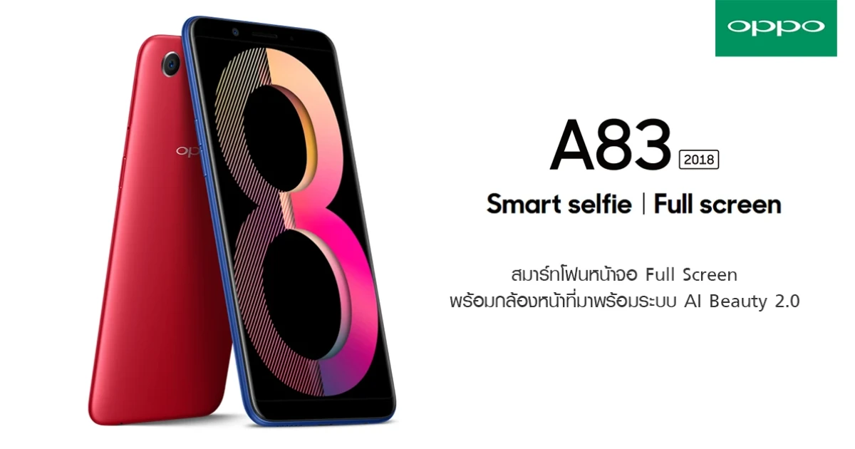 OPPO A83 (2018) มีให้เลือก 3 สี ได้แก่ สีแดง, สีน้ำเงิน และสีทอง ราคาเปิดตัวในอินเดีย 15,990 รูปี คิดเป็นเงินไทย 7,563 บาท ซึ่งในบ้านเราก็น่าจะเปิดราคามาไม่ต่างไปจากนี้ครับ (OPPO A83 เปิดตัวราคา 7,990 บาท) เรียกได้ว่าเป็นรุ่นอัพเดทครับ ยังไม่ถึงขนาดเป็นรุ่นใหม่ แต่ก็น่าจะนำเข้ามาจำหน่ายในบ้านเราแน่นอน