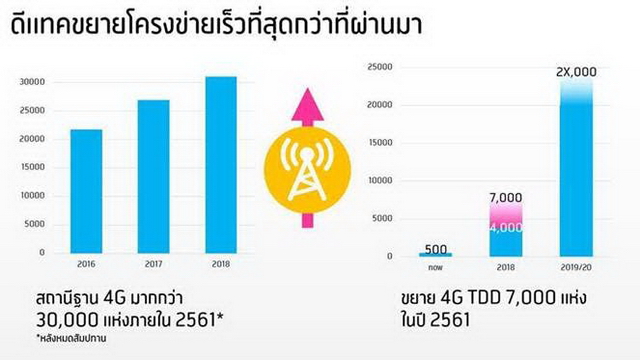 ทั้งนี้ เพื่อเพิ่มประสิทธิภาพโครงข่าย ดีแทคยังเร่งขยายสถานีฐานอย่างรวดเร็วกว่าที่ผ่านมา โดยมีการขยายเพิ่มสถานีฐาน 3G/4G บนโครงข่าย 2100 MHz จำนวน 4,000 แห่งต่อปีในช่วง 2560-2561 ซึ่งขยายรวดเร็วกว่าเดิมถึง 2 เท่าเมื่อเทียบกับปีก่อน ดีแทคยังรุกขยายสถานีฐานสำหรับการใช้งานบนคลื่นความถี่ 2300MHz dtac TURBO ด้วยเทคโนโลยี 4G TDD ให้ได้อีกอย่างน้อย 4,000 แห่งในปีนี้ตามข้อตกลงกับทีโอที และหากดีแทคสามารถทำได้เต็มกำลังการติดตั้งสถานีฐานคาดว่าจะขยายได้มากถึง 7,000 แห่งในปลายปีนี้