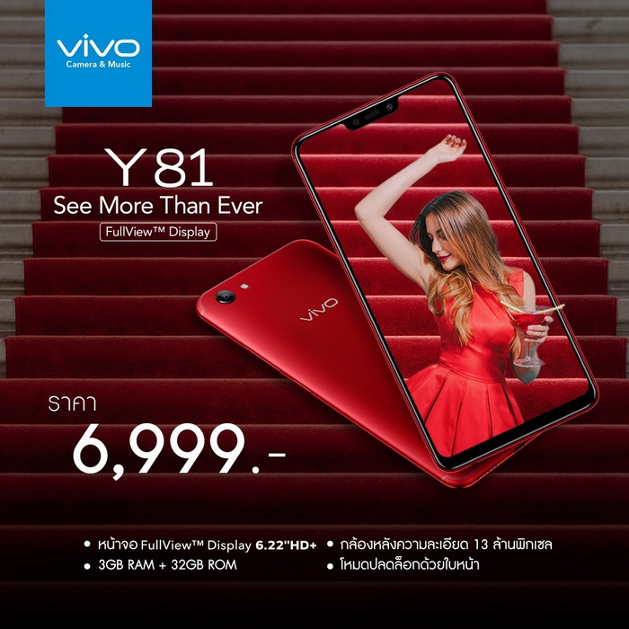 Vivo Y81 มีให้เลือก 2 สี ได้แก่ สีดำ และสีแดง วางจำหน่ายในราคา 6,999 บาท
