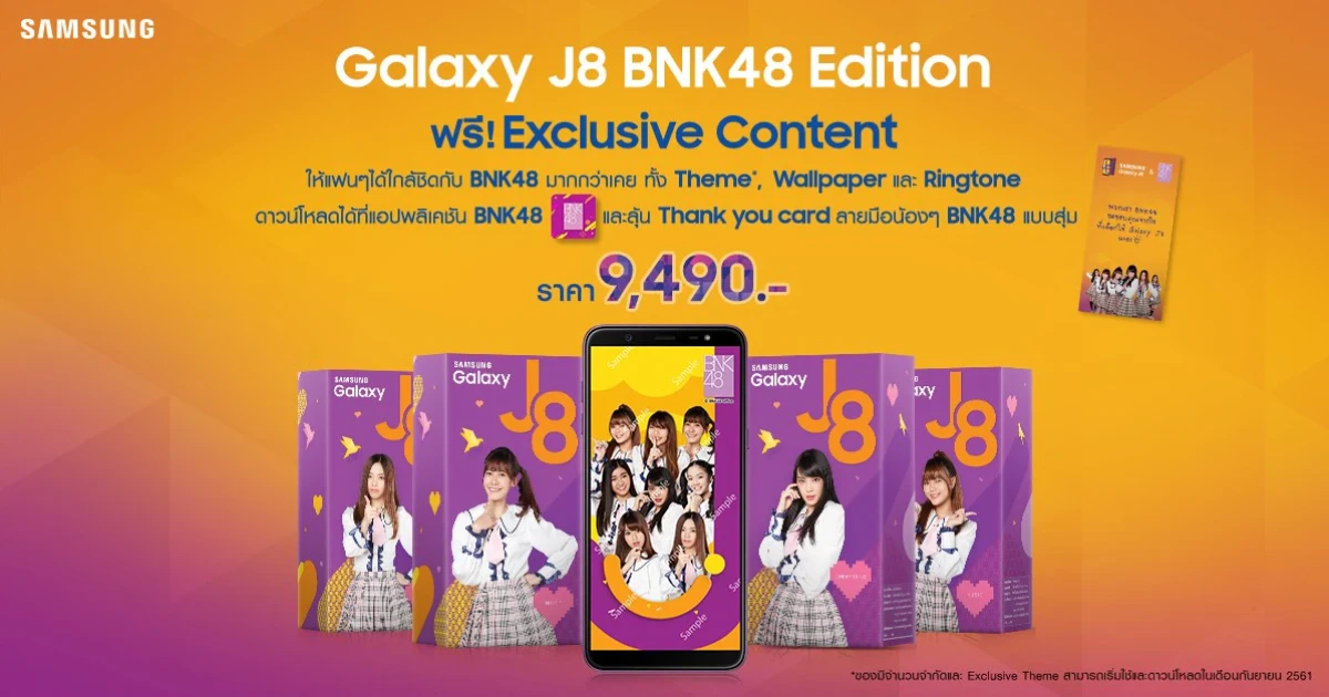 พิเศษสุด Samsung Galaxy J8 x BNK48 แพ็กเกจดีไซน์สุดเก๋ และสุ่มคอนเทนต์สุดเอ็กซ์คลูซีฟส่งตรงจาก BNK48 ทั้ง วอลเปเปอร์ (1 ภาพ) และริงโทน (1 เสียง) พร้อมลุ้นรับการ์ดแทนคำขอบคุณจากเหล่าน้องๆ BNK48 (ขอบอกเลยว่าน่ารักมากๆ) ราคาเครื่องละ 9,490 บาท มีให้เลือกถึง 3 สีได้แก่ สีม่วง, สีดำ และสีทอง จำหน่ายที่ ซัมซุง ออนไลน์ ช้อป รวมถึง ผู้ให้บริการเครือข่าย และร้านค้าชั้นนำ ทั่วประเทศ พร้อมกัน ตั้งแต่วันนี้เป็นต้นไป
