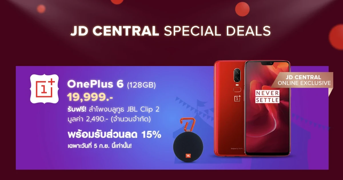 - สำหรับส่วนลดในวัน "OnePlus Day" ทุกๆ ท่านที่ช้อปปิ้งผ่านทาง JD Central ทุกออเดอร์ ลดเพิ่มไปอีก 15%
