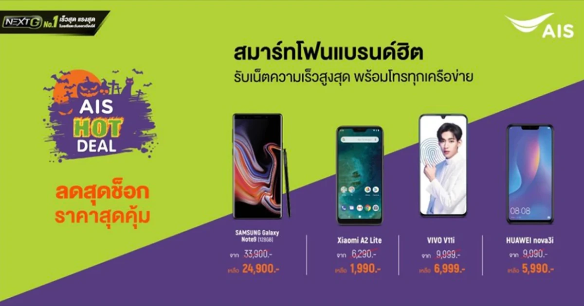"AIS Hot Deal" โปรโมชั่นพิเศษจาก เอไอเอส กับสมาร์ทโฟนแบรนด์ฮิต ลดราคาพิเศษสุดคุ้ม พร้อมรับแพ็กเกจอินเตอร์เน็ตความเร็วสูงสุด โทรทุกเครือข่าย วันนี้ - 31 ตุลาคม 2561 เท่านั้น
