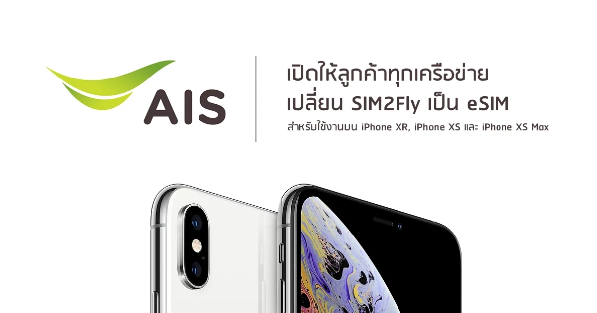 AIS อำนวยความสะดวกให้ลูกค้าทุกเครือข่าย สามารถเปลี่ยน SIM2Fly เป็น eSIM สำหรับใช้งานบน iPhone XR, iPhone XS และ iPhone XS Max ได้แล้ว ที่ AIS SHOP ทุกสาขาทั่วประเทศ รวม 157 สาขา (ยกเว้นสาขาสนามบินสุวรรณภูมิและสนามบินดอนเมือง) ฟรีค่าบริการเปิด ตั้งแต่วันนี้ - 10 มกราคม 2562 ซึ่งจะช่วยเพิ่มความสะดวกให้ลูกค้าที่เดินทางไปต่างประเทศ สามารถใช้ SIM2Fly (ที่เป็น eSIM) ควบคู่กับซิมหลักของลูกค้าได้เลย โดยไม่ต้องถอดซิมหลักออก