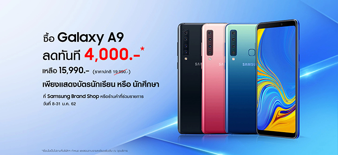 พิเศษสำหรับ Samsung Galaxy A9 สมาร์ทโฟนกล้องหลัง 4 ตัวเครื่องแรกของโลก รับส่วนลด 4,000 บาท เมื่อแสดงบัตรนักเรียนหรือบัตรนักศึกษา จากราคาปกติ 19,990 บาท เหลือเพียง 15,990 บาท หรือรับส่วนลดทันที 2,000 บาท กรณีไม่สามารถแสดงบัตรได้ พร้อมรับฟรี Fast Charge Battery Pack 10,000 mAh มูลค่า 1,290 บาท (จำนวนจำกัดเพียง 20,000 ชิ้นเท่านั้น)