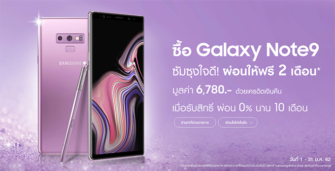 ซัมซุง ใจดีผ่อนให้ฟรี 2 เดือน! สำหรับ Samsung Galaxy Note9 สุดยอดสมาร์ทโฟนทรงพลังสุดพรีเมี่ยม โดยรับเครดิตเงินคืนมูลค่า 6,780 บาท เมื่อชำระด้วยบัตรเครดิตธนาคารที่ร่วมรายการพร้อมใช้สิทธิ์ผ่อน 0% นาน 10 เดือน หรือเลือกรับส่วนลดสูงสุด 5,000 บาท เมื่อนำเครื่องเก่ามาแลกเครื่องใหม่ จากราคาปกติ 33,900 บาท
