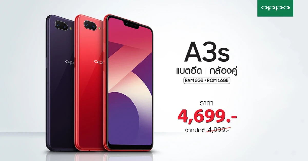 ด้วยยอดขายดีเป็นอันดับหนึ่งของ OPPO A3s สำหรับปีที่ผ่านมา สมาร์ทโฟนสุดคุ้มในสโลแกน "แบตอึด กล้องคู่" ที่มาพร้อมกับสเปคจัดเต็ม ออปโป้ จึงได้ปรับราคาพิเศษสำหรับ OPPO A3s รุ่น 16GB เหลือเพียง 4,699 บาท (จากราคาเปิดตัว 4,999 บาท) เพื่อให้ลูกค้าสามารถจับจองเป็นเจ้าของได้ง่ายมากยิ่งขึ้น