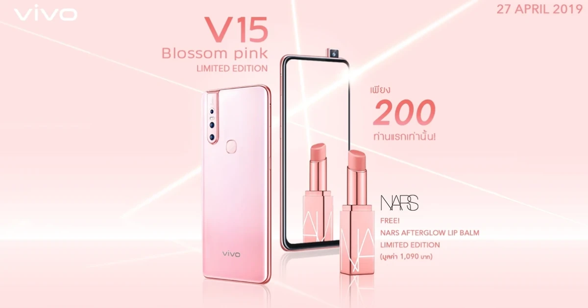 Vivo V15 สีใหม่ล่าสุด Blossom Pink Limited Edition เพิ่มความสดใสในหน้าร้อนนี้ เริ่มวางจำหน่ายอย่างเป็นทางการตั้งแต่วันที่ 27 เมษายน 2562 ณ Vivo Brand Shop, Banana, Jaymart, TG Fone, CSC, IT City ทั่วประเทศ สิทธิพิเศษสำหรับลูกค้าที่ซื้อ Vivo V15 สี Blossom Pink Limited Edition 200 ท่านแรก รับไปเลย! ลิปสติกจากแบรนด์ NARS รุ่น Afterglow Lip Balm Limited Edition มูลค่า 1,090 บาท