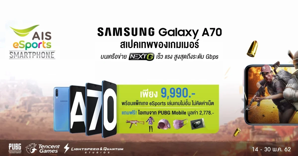 พบกับโปรโมชั่นสุดคุ้มจากเอไอเอส ให้คุณเป็นเจ้าของสมาร์ทโฟน "Galaxy A70" ในราคาสุดเอ็กซ์คลูซีฟ มอบส่วนลดค่าเครื่องสูงสุด 6,000 บาท เหลือเพียง 9,990 บาท จากราคาปกติ 15,990 บาท มาพร้อมกับแพ็คเกจ eSports ให้ลูกค้าเล่นเกมยอดฮิตได้แบบไม่อั้น ไม่เสียค่าเน็ต ทั้ง PUBG Mobile, Ragnarok, ROV และ Free Fire พร้อมรับไอเทมเอ็กซ์คลูซีฟมากมายจาก PUBG และ Hearthstone รวมมูลค่ากว่า 3,778 บาท ตั้งแต่วันนี้ - 30 พฤษภาคม 2562