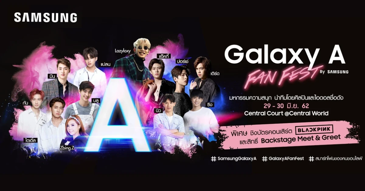 ไทยซัมซุง อิเลคโทรนิคส์ จำกัด จัดกิจกรรมสุดว้าว มอบความสนุกแบบไร้ขีดจำกัดในงาน "Galaxy A Fan Fest" มหกรรมความสนุกใจกลางเซ็นทรัลเวิลด์ พร้อมเปิดพื้นที่ให้แฟนๆ ได้สัมผัสประสบการณ์สุดพิเศษกับสมาร์ทโฟนตระกูล Galaxy A ที่มาตอบโจทย์คน 'Gen Z' ในแนวคิด "สมาร์ทโฟนของคนชอบไลฟ์" ที่จะต่อยอดจินตนาการของผู้ใช้งานยุคใหม่ให้เป็นไปได้ในทุกด้าน ทั้งการสื่อสาร เล่นเกม ถ่ายรูป การครีเอทคอนเท้นต์ รวมถึงการใช้งานเพื่อความบันเทิงในทุกด้าน และที่พิเศษสุดภายในงานจะได้พบกับ 'Galaxy A80' สมาร์ทโฟนที่ถูกสร้างสรรค์ขึ้นมาด้วยนวัตกรม Rotating Triple Camera ครั้งแรกของโลก พร้อมสร้างประสบการณ์การถ่ายภาพที่เปี่ยมไปด้วยคุณภาพสูงสุดแบบเดียวกันทั้งกล้องหน้าและกล้องหลังที่จะมาปฏิวัติรูปแบบการถ่ายภาพไปสิ้นเชิง