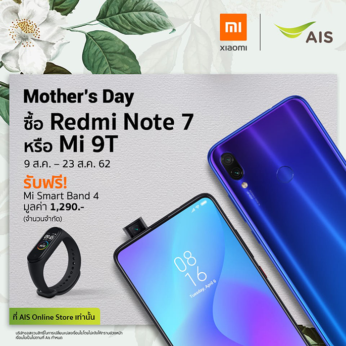 พิเศษกับโปรโมชั่นวันแม่ AIS Hot Deal จาก AIS ให้คุณซื้อ Mi 9T สี Carbon Black และ Glacier Blue ในราคาเริ่มต้นเพียง 9,490 บาท พร้อมรับของสมนาคุณพิเศษ ฟรี Mi Smart Band 4 เมื่อซื้อที่ AIS Online Store วันนี้ - 23 สิงหาคม 2562 ผู้สนใจสามารถดูรายละเอียดเพิ่มเติมที่ store.ais.co.th/th/mobile-phone/xiaomi/xiaomi-mi-9t.html
