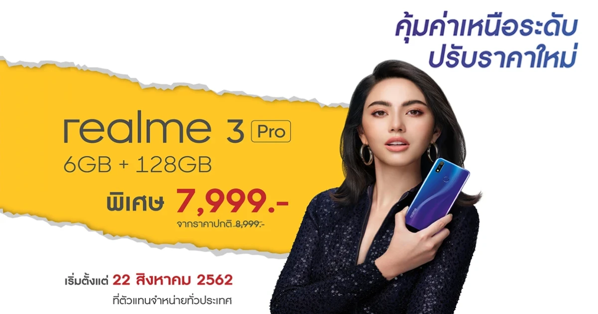 - realme 3 Pro ราคา 6,399 บาท จากราคาปกติ 6,799 บาท ความจุ 4GB + 64GB สี Nitro Blue/Lightning Purple