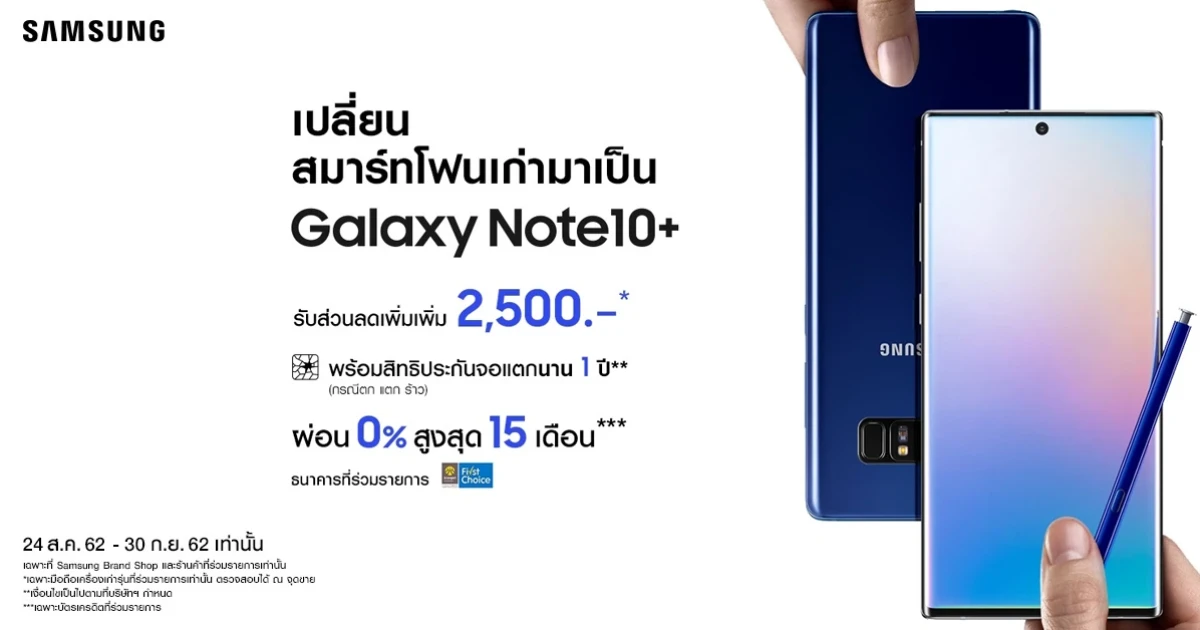 พิเศษ! ซัมซุง ส่งโปรโมชั่นเก่าแลกใหม่ รับส่วนลดเพิ่มสูงสุด 2,500 บาท เมื่อนำโทรศัพท์มือถือเครื่องเก่ารุ่นใดยี่ห้อใดก็ได้ มาแลกซื้อ Galaxy Note 10+ ตั้งแต่วันที่ 24 สิงหาคม และ Galaxy Note 10 ตั้งแต่วันที่ 1 กันยายนเป็นต้นไป ที่ Samsung Brand Shop และร้านค้าที่ร่วมรายการ ถึงวันที่ 30 กันยายน 2562 เท่านั้น สามารถตรวจสอบรายละเอียดโปรโมชั่นเพิ่มเติมได้ที่จุดขาย หรือเว็บไซต์ www.samsung.com/th/note10/specialoffer