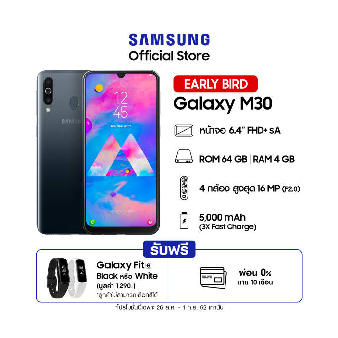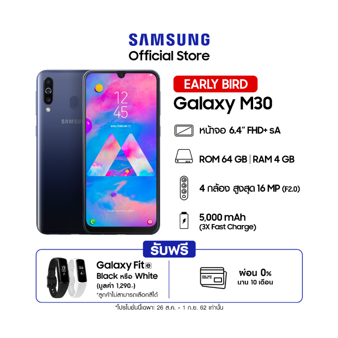 Samsung Galaxy M30 มีให้เลือก 2 สี คือ Gradation Black และ Gradation Blue วางจำหน่ายอย่างเป็นทางการบนลาซมอล (LazMall) แล้ววันนี้ ในราคา 6,990 บาท พร้อมโปรโมชั่นของแถมสุดพิเศษ! สำหรับทุกคำสั่งซื้อบนลาซมอล ตั้งแต่วันนี้ - 1 กันยายน 2562 รับฟรี! Galaxy Fit e มูลค่ากว่า 1,290 บาท สามารถดูรายละเอียดเพิ่มเติมได้ที่ lazada.co.th