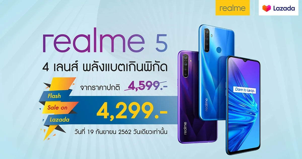 realme แบรนด์สมาร์ทโฟนเพื่อคนรุ่นใหม่ จับมือยักษ์ใหญ่ด้านอีคอมเมิร์ซ อย่าง Lazada จัดโปรพิเศษ Flash Sale ลดราคาพิเศษ realme 5 ก่อนวางจำหน่ายจริง ราคาเพียง 4,299 บาท จากปกติราคา 4,599 บาท ในวันที่ 19 กันยายน 2562 นี้