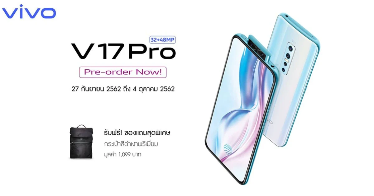 - สำหรับผู้ที่ทำการจอง Vivo V17 Pro สามารถรับเครื่องพร้อมของแถมในวันที่ 5 ตุลาคม 2562 เป็นต้นไป